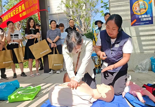在互動(dòng)體驗(yàn)環(huán)節(jié),工作人員展示結(jié)繩演練并指導(dǎo)實(shí)操,保障群眾掌握基本結(jié)繩逃生技能?,F(xiàn)場(chǎng)還設(shè)置了仿真人體模型,醫(yī)護(hù)人員指導(dǎo)群眾進(jìn)行心肺復(fù)蘇操作練習(xí),同時(shí)為群眾演示海姆立克急救法操作流程。