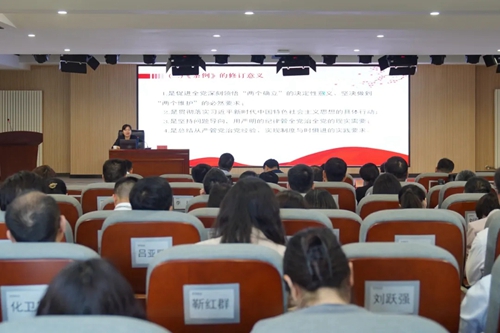 市紀委監(jiān)委駐城發(fā)集團紀檢監(jiān)察組副組長姬小靜,以《做遵規(guī)守紀的明白人》為題,分別從《條例》的歷史沿革、修訂意義、新變化和特點等方面,逐章逐條深度解讀新修訂的《中國共產黨紀律處分條例》。深刻領悟全面從嚴治黨的實踐要求,切實學出政治忠誠、學出清正廉潔、學出擔當作為。