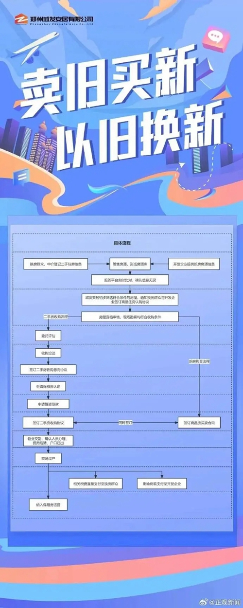 鄭州房產(chǎn)市場“賣舊買新、以舊換新”旨在滿足群眾改善性住房需求。具體來講,由政府指定收購主體—鄭州城市發(fā)展集團(tuán)有限公司與具有改善需求的換房群眾進(jìn)行洽談,通過價(jià)格評(píng)估、銀行貸款等一系列工作流程,收購群眾二手房源,為群眾購買新房提供資金支持,暢通買賣渠道。此外,群眾也可通過市場化方式進(jìn)行交易。