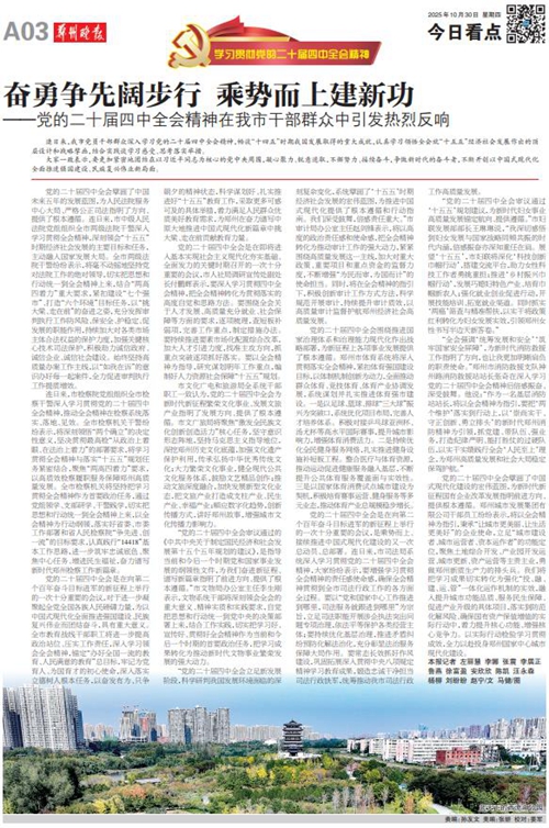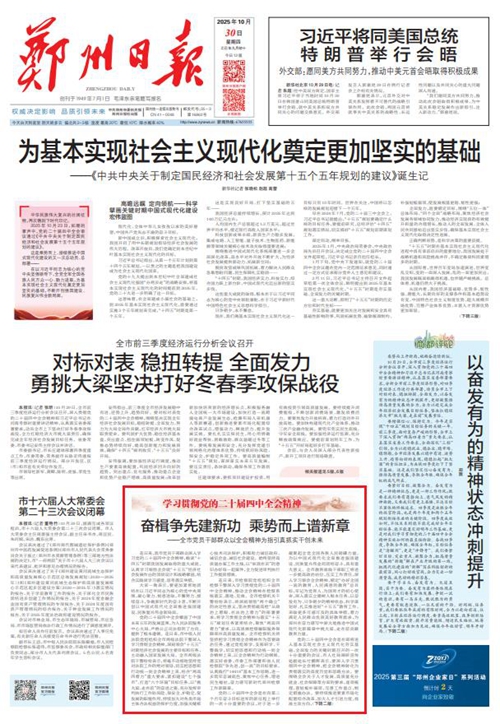 黨的二十屆四中全會擘畫了中國式現(xiàn)代化建設(shè)的宏偉藍(lán)圖,為新時(shí)代新征程國有企業(yè)改革發(fā)展指明前進(jìn)方向、提供根本遵循,鄭州城發(fā)集團(tuán)廣大黨員干部群眾深受鼓舞、倍感振奮。近日,《鄭州日報(bào)》《鄭州晚報(bào)》開設(shè)了【學(xué)習(xí)貫徹黨的二十屆四中全會精神】專欄,2025年10月30日,報(bào)道了鄭州城發(fā)集團(tuán)深入學(xué)習(xí)貫徹落實(shí)黨的二十屆四中全會精神,以全會精神為指引真抓實(shí)干創(chuàng)未來。