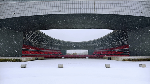 奧體中心的場(chǎng)館在白雪映襯下