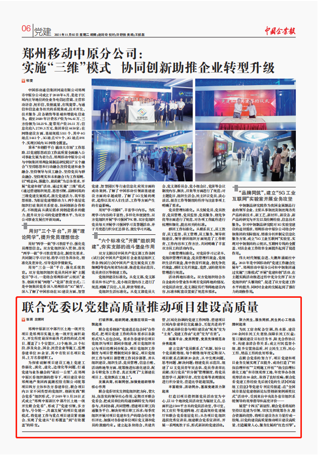西流湖公司始終堅持“抓好黨建就是最大的政績”,創(chuàng)新“黨建進總包合同”合作模式,貫徹落實“支部建在項目上,黨旗飄在工地上”的工作思路,以中原新區(qū)中部片區(qū)土地一級開發(fā)聯(lián)合黨委和項目黨支部建設為抓手,以“12343”黨建工作體系為指引,讓黨的主張、黨的作風、黨組織的力量在項目建設中處處彰顯,充分激發(fā)黨員的先鋒模范作用和黨組織的堅強堡壘作用,將黨建轉化為生產(chǎn)力,真正實現(xiàn)黨建促發(fā)展的“紅色引擎”作用。公司黨建工作先進經(jīng)驗榮登《中國企業(yè)報》,意味著公司黨建工作先進經(jīng)驗對于全國企業(yè)黨建具有良好的借鑒意義,標志著公司黨建工作及宣傳水平再上新臺階。